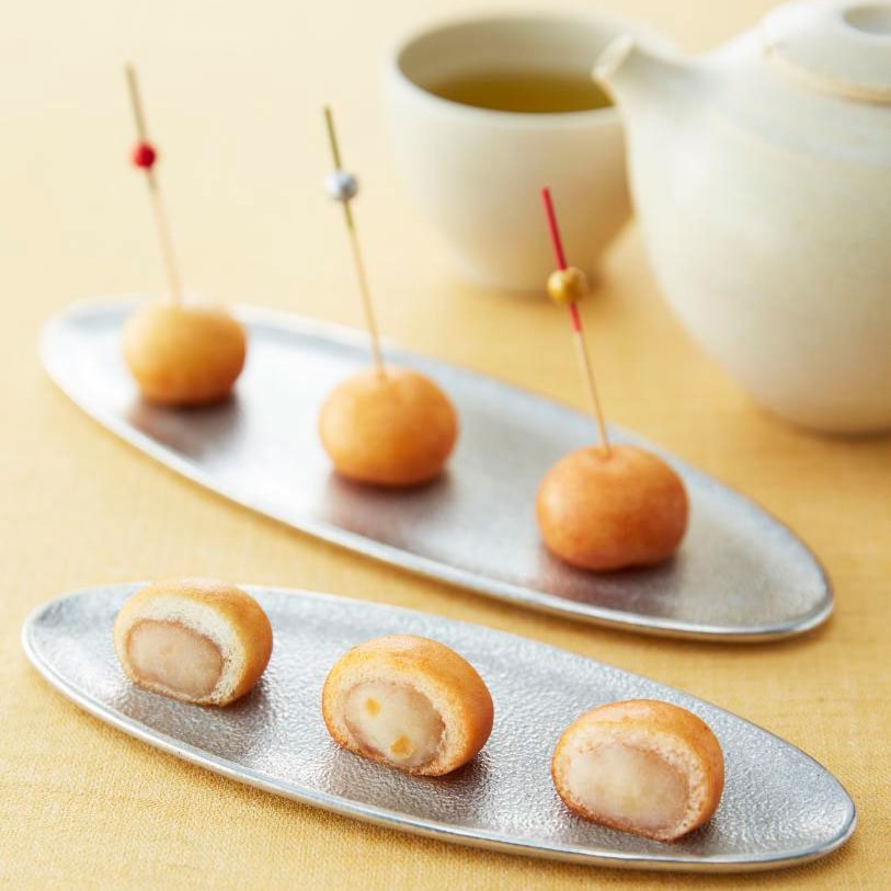 旬のりんごで作ったコンポートに白餡を加えたフルーツ餡。豊かな香りと甘酸っぱい味わい、シャキシャキとしたりんごの果肉が楽しめます。